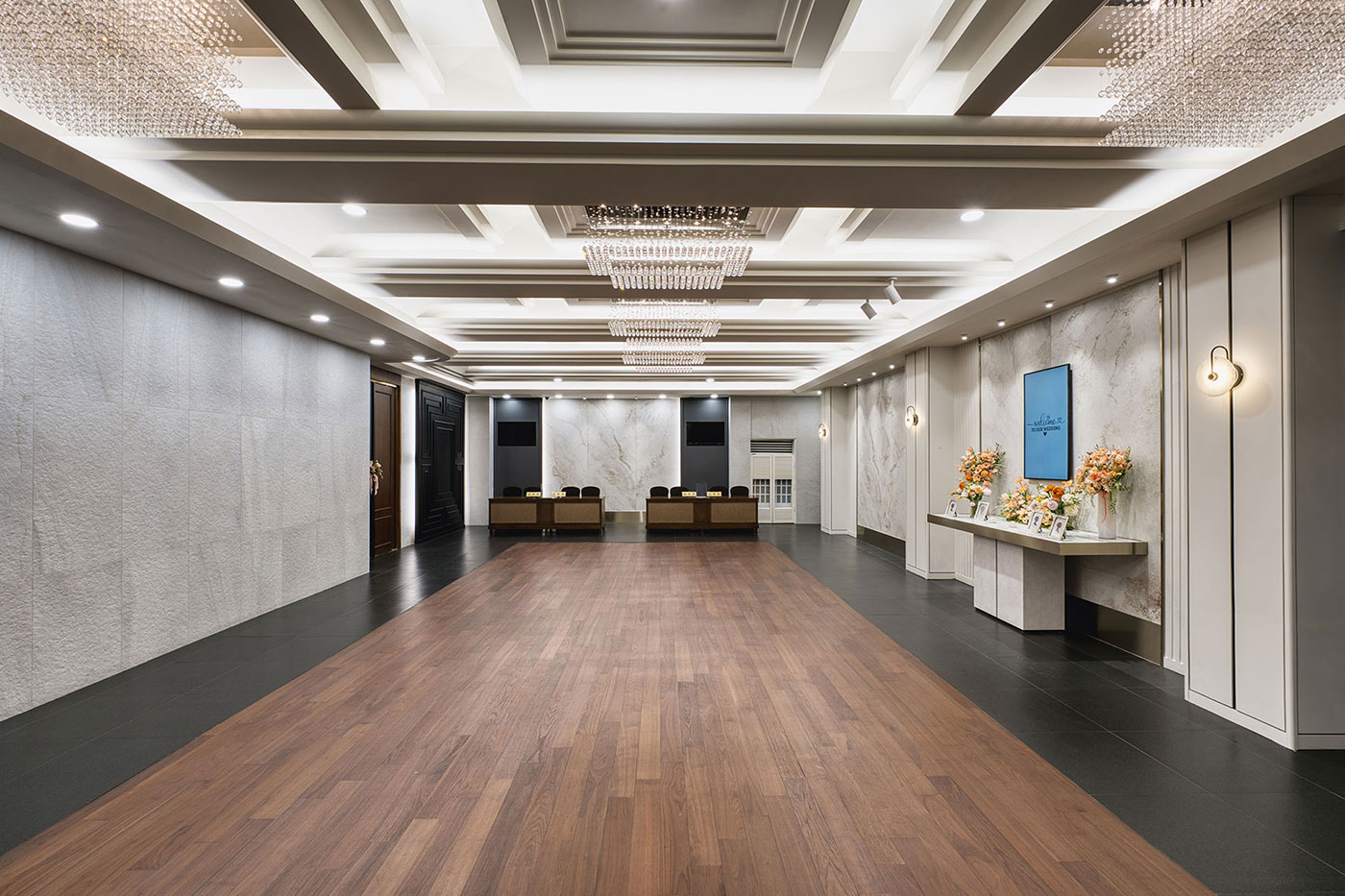 들어오는 순간부터 여유로움과 차분함을 주어 고객님의 품격을 높여 드리는 고품격의 로비라운지에서 하객을 맞이 할 수 있도록 꾸몄습니다. 축하객들을 위해 준비된 넓고 탁트인 로비와 접수대는 감각적인 인테리어와 수려한 조명, 깔끔한 디자인으로 품격있는 공간을 제공합니다. 또한 신랑신부, 하객의 동선을 고려하여 모든 시설물에 이동이 편리합니다.